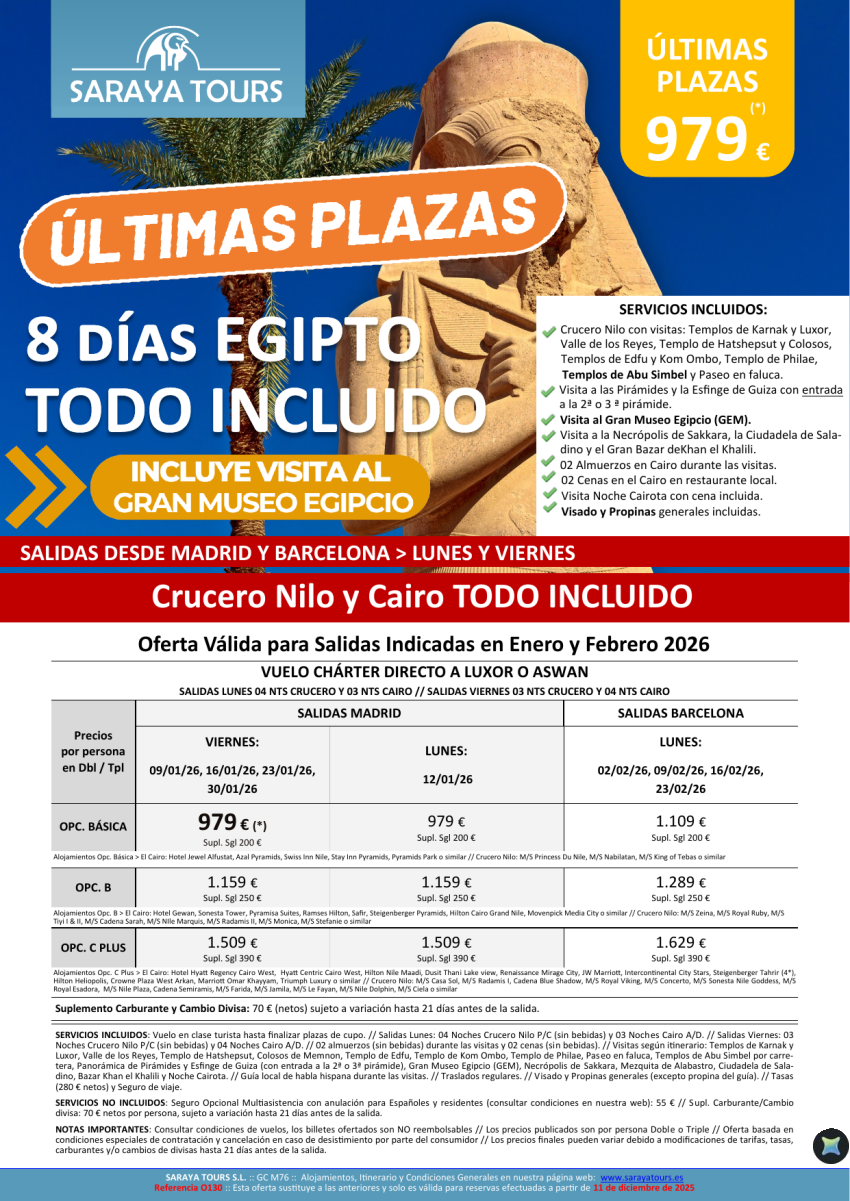 Últimas Plazas Egipto Todo Incluido. Vuelos desde BCN & MAD. Crucero NIlo y Cairo + visitas, visado y propinas